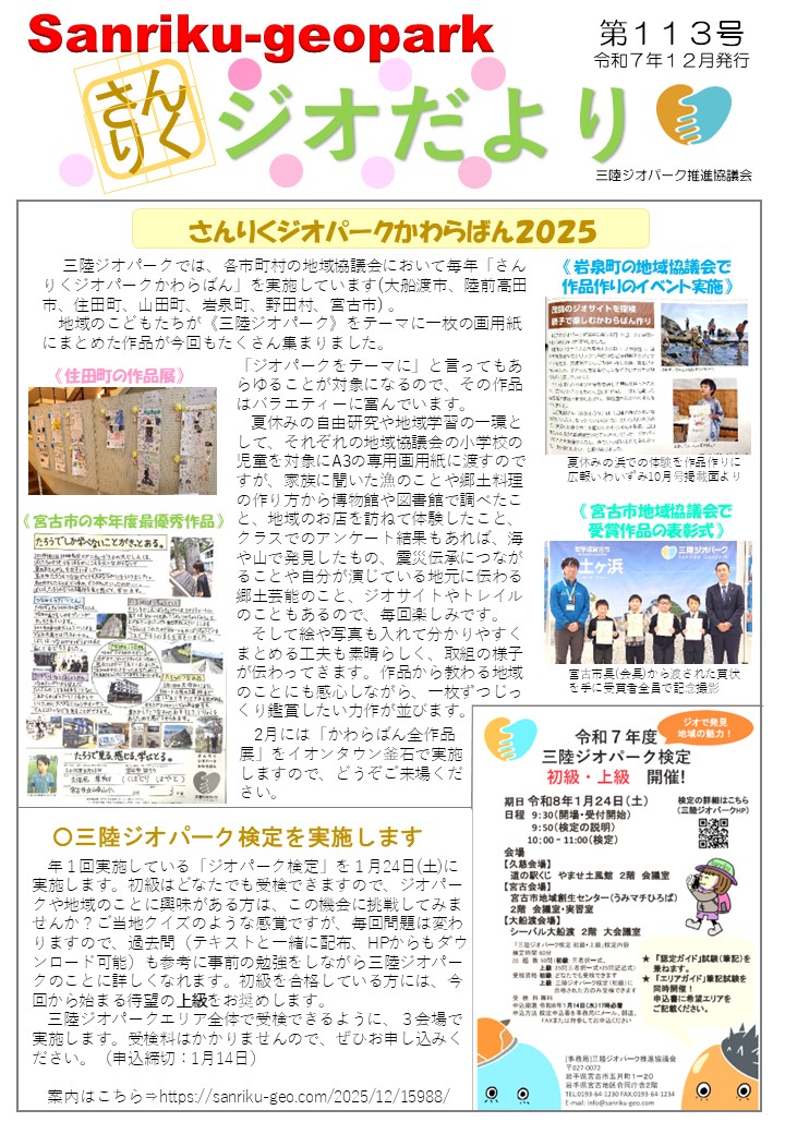今回のジオだより113号では、「さんりくジオパークかわらばん」の紹介と「ジオパーク検定」のお知らせ、釜石市で開催している「鉄」に関わるイベントの紹介をしています。どうぞご覧ください。